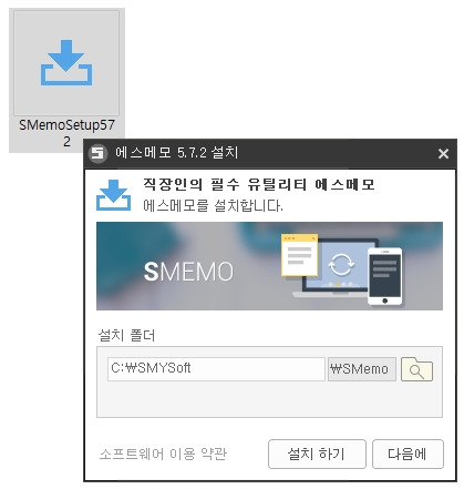 홈페이지에 접속하여 메인화면에서 [PC 다운로드] 버튼을 누르시면 다운받을 수 있고, 인스톨 파일을 실행하여 설치 후 실행할 수 있습니다. 현재날짜를 기준으로 최신버전은 5.7.2이고, 필요에 따라서는 무설치 버전의 s메모 다운로드 받아 이용할수도 있습니다.